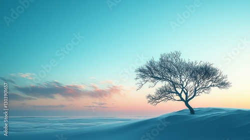 Serene Winter Landscape Lone Tree in Snowy Field at Sunset