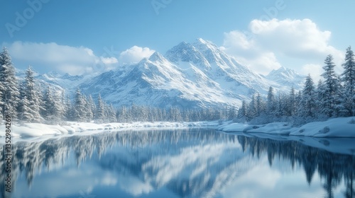 Serene Winter Landscape: Majestic Snow-Capped Mountains Reflected in a Calm Lake