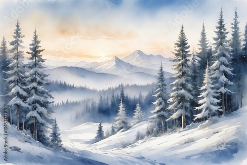 Serene winter landscape with evergreen trees and mountains under a pastel sunrise in watercolor style