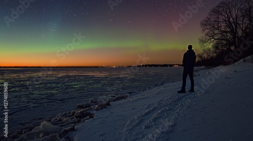Serene Winter Landscape with Northern Lights Over Frozen Lake