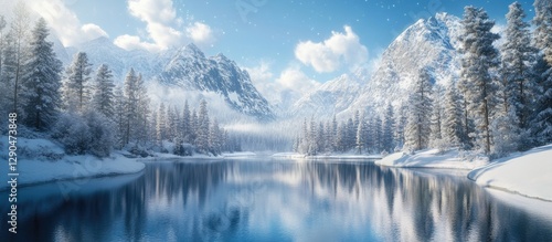 Serene winter landscape with snow-covered mountains and calm reflective lake under a blue sky with fluffy white clouds and pine trees in foreground