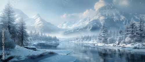 Serene Winter Landscape with Snowy Mountains and River
