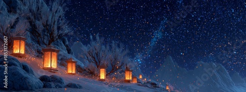 Serene Winter Ritual Under Starlit Sky with Glowing Lanterns and Frosty Landscape
