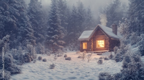 Serene winter scene of a cozy cabin nestled among snow-covered trees in forest