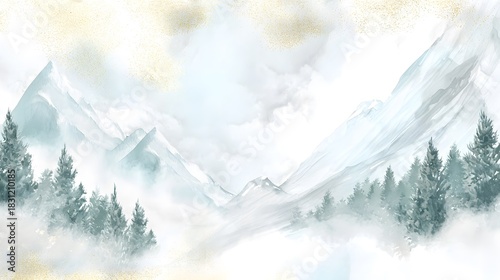 Serene winter watercolor background snow mountains pine forest elegant wall art design
