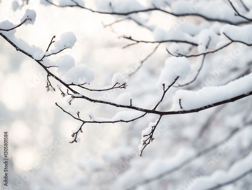 Serene Winter Wonderland: Snow-Covered Branches and Tranquil Landscape. Perfect for holiday cards,