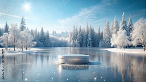 Serene Winter Wonderland with a Circular Display Platform on a Frozen Lake