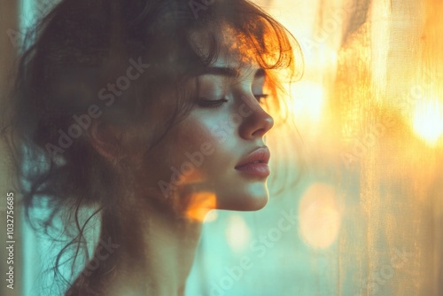 Serene woman gazing out a sunlit window