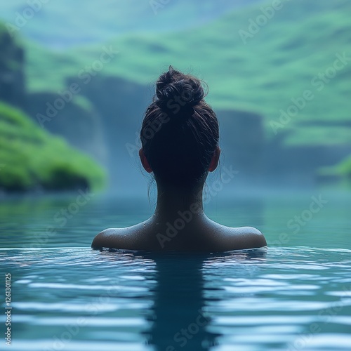 Serene woman relaxing in a tranquil natural hot spring surrounded by lush greenery