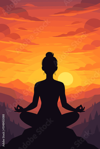 Serene woman silhouette meditating in lotus pose on mountain peak at vibrant sunset, tranquil landscape, peaceful mindfulness, yoga meditation, nature retreat, dusk sky illustration, vector art