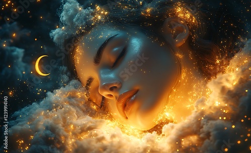 Serene Woman Sleeping Amidst Glowing Clouds and Stars Under a Crescent Moon