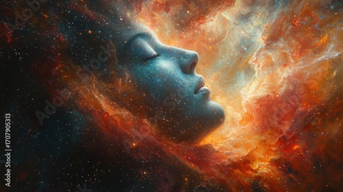 Serene woman's face merges with vibrant nebula, cosmic dreamscape.