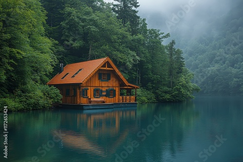 Serene wooden cabin on tranquil lake surrounded by lush green forest in early morning light