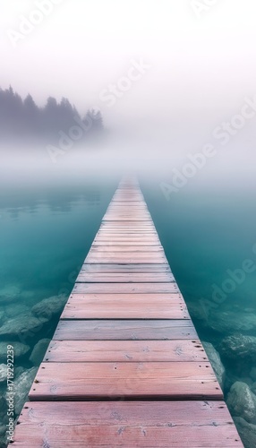 Serene Wooden Pier Extending into a Misty Lake Surrounded by Lush Forest and Tranquil Waterscape