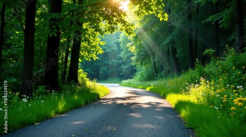 Serene woodland path bathed in sunlight, winding through lush greenery and vibrant wildflowers on a summer morning