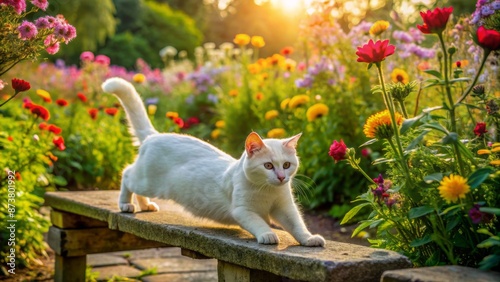 Serenely beautiful fluffy white cat stretches on weathered stone bench amidst vibrant colorful flowers and lush greenery in idyllic garden setting.
