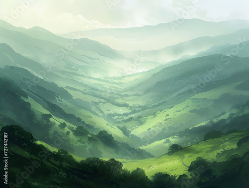 Serenely Lit Lush Green Valley in Tranquil Light - Ideal for Natural Peace Concept, Sunrise/Sunset Calmness, Environment Template - Scenic Landscape Photography