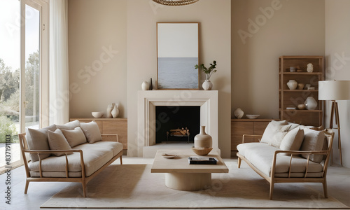 Serenely stylish living room interior with elegant furnishings and panoramic ocean views through expansive glass windows