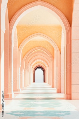 Serenity in peach-toned architecture. A long corridor with arches creates a peaceful atmosphere.