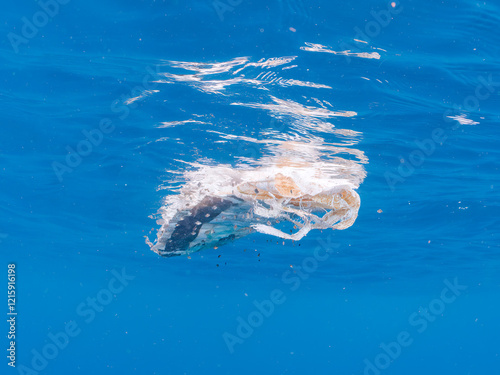 漂流ゴミに住む可愛いオヤビッチャ(スズメダイ科)他の幼魚の群れ 英名学名:Sergeant Major (Abudefduf vaigiensis) 静岡県伊豆半島賀茂郡南伊豆町中木ヒリゾ浜2024年