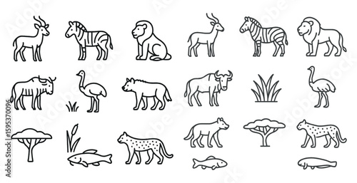 Series of animals in a line, including a zebra, a giraffe, a lion, and a kangaroo