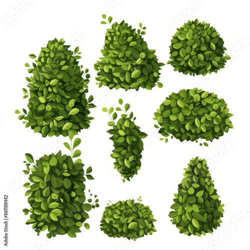 series of silhouettes of green bushes, figures on a white background.