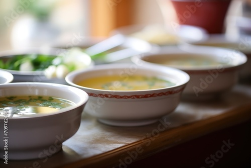 series of soup bowls ready for serving on a buffet table