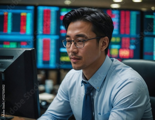 Serious Asian Businessman Examining Financial Statistics and Trends on Multiple Computer Displays, Perfect for Illustrating Data Science, Fintech, and Investment Technology