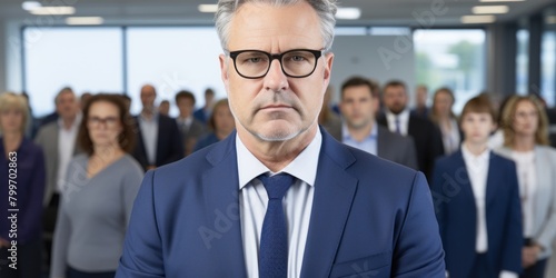 Serious businessman in formal suit and glasses standing in front of a crowd