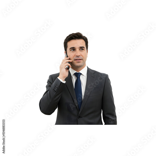 Serious businessman on phone, dressed in formal suit, perfect for communication, sales, or executive themes