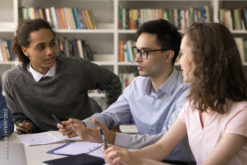 Serious clever Indian guy talking to diverse schoolmates met in university library. Group of students listen team leader make speech, share solution, express opinion, studying together on joint task