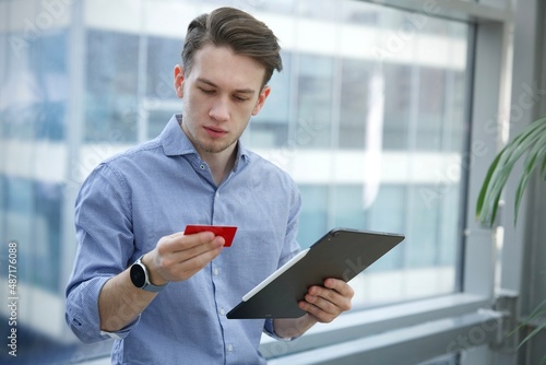 Serious concentrated focused guy, young man shopping in internet online on his laptop tablet computer and holding, looking at his credit bank card in hand in office building, entering information.