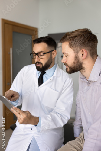 Serious Hispanic practitioner doctor showing electronic prescription to patient on tablet, explaining diagnosis, medical checkup report, giving healthcare recommendation in clinic. Vertical shot