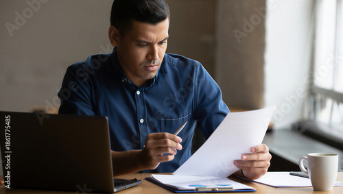 Serious Man Reviewing Business Documents, Financial Reports & Important Paperwork. Focused Professional Analysis.