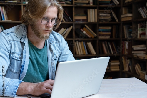 Serious man student using laptop looking at computer screen typing e learning internet course focused on study online in app think on work task doing project research sit at library desk, copy space
