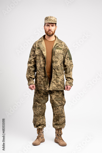 Serious middle aged soldier wearing camouflage military uniform looking at camera isolated on white background