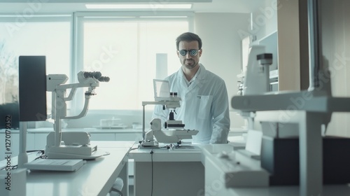 Serious ophthalmologist with trial frame in modern eye clinic for vision check