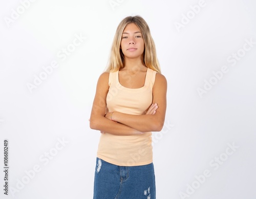 Serious pensive Beautiful teen girl wearing sleeveless t-shirt feel like cool confident entrepreneur cross hands.