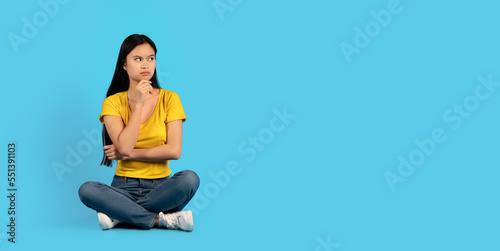 Serious pensive millennial korean lady student in yellow t-shirt sits on floor, look at empty space, thinks