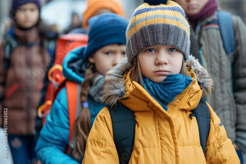 Serious schoolkids in warm clothes with backpacks standing on urban city street