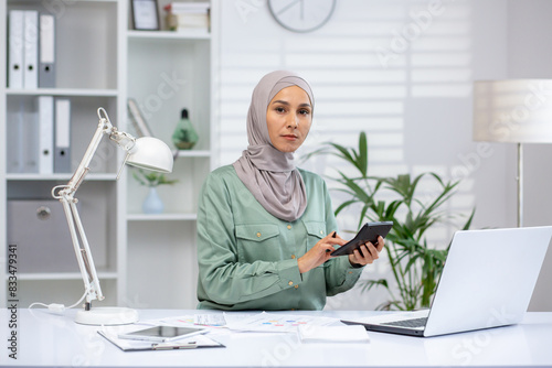 Serious woman financier in hijab using calculator to prepare financial report at modern office desk with laptop and documents.