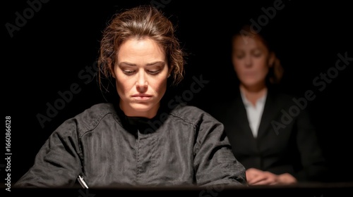 Serious woman with head down and another person blurred in the background against a dark backdrop