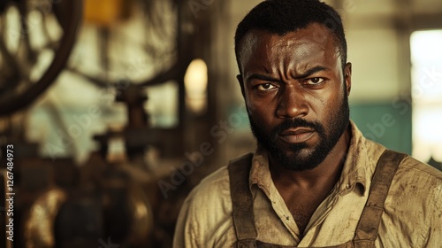 Serious worker in factory, machinery blurred background, industrial portrait, for news, articles