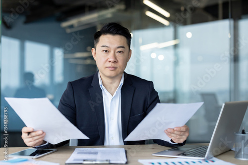 Serious young Asian male businessman working in the office at his desk, holding documents and a contract in his hands, spreading his arms in frustration and looking at the camera