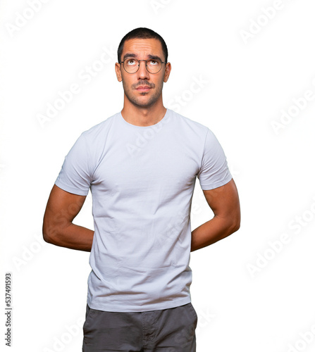 Serious young man looking against background