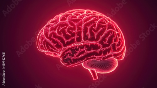 Serotonin System Complexity Concept. Futuristic Neon Brain Illustration with Bright Pink Lighting and Detailed Texture on Dark Background