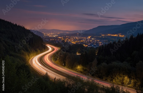 Serpentine highway with light trails curves through a valley at twilight, nestled between dark hills and a softly lit town