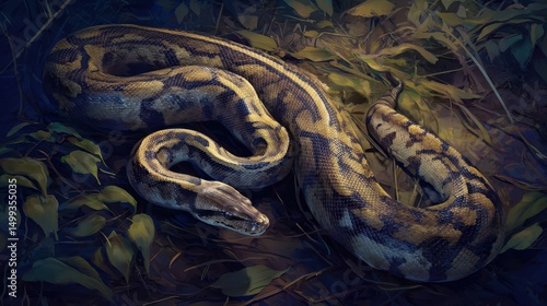 Serpentine reptile resting amidst foliage in shadowy environment.