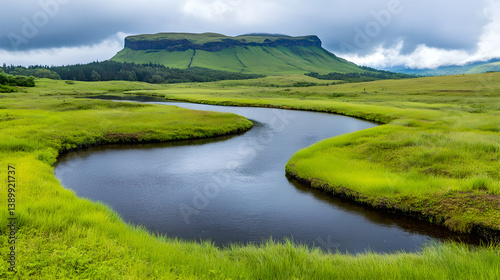 Serpentine River in Green Meadow with Flat Topped Mountain under Overcast Sky