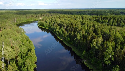 Serpentine river meanders through dense, verdant forest under a partly cloudy sky